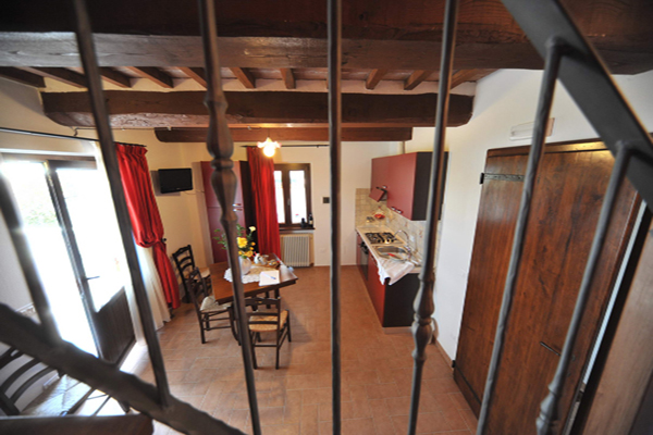 Im oberen Bereich des Appartements, der über eine bequeme Treppe erreichbar ist, schmiegt sich die Farbe Rot der Kirschen an das Panorama der umliegenden Hügeln und der berühmten mittelalterlichen Städte von Anghiari und Citerna. Der Kirschbaum ist eine einzigartige Wohnung auf zwei Stockwerken. Der Wohnbereich im ersten Stock mit Küche, handgefertigtem Schlafcouch (160x200, Holz-Lattenrost und orthopädischer Matratze) und großer, exklusiver Terrasse (16 qm) mit Gartenmöbeln. Im zweiten Stock befinden sich Schlafzimmer und Bad mit Duschkabine (Größe 70x90).Appartements - Der Pfirsichbaum | Der Apfelbaum | Der Birnbaum | Der Granatapfelbaum | Der Kirschbaum